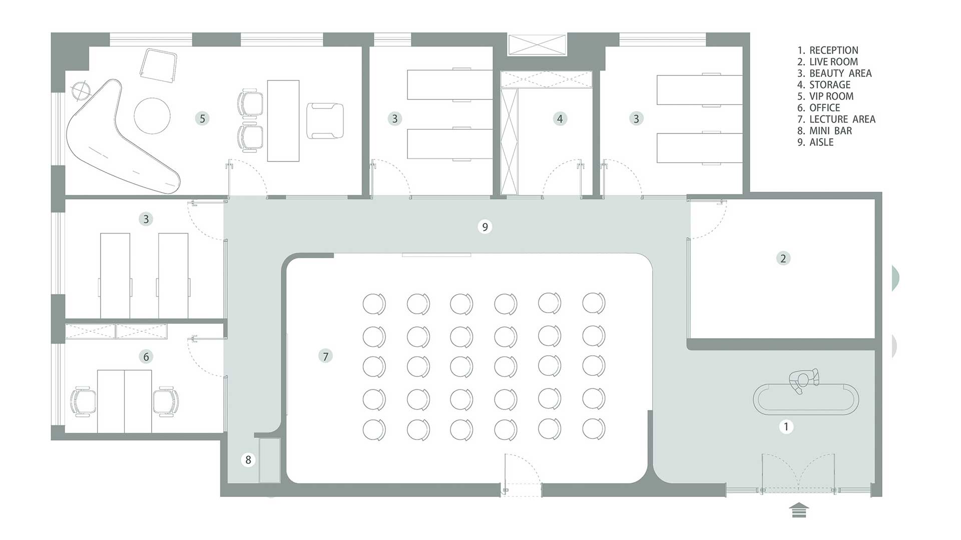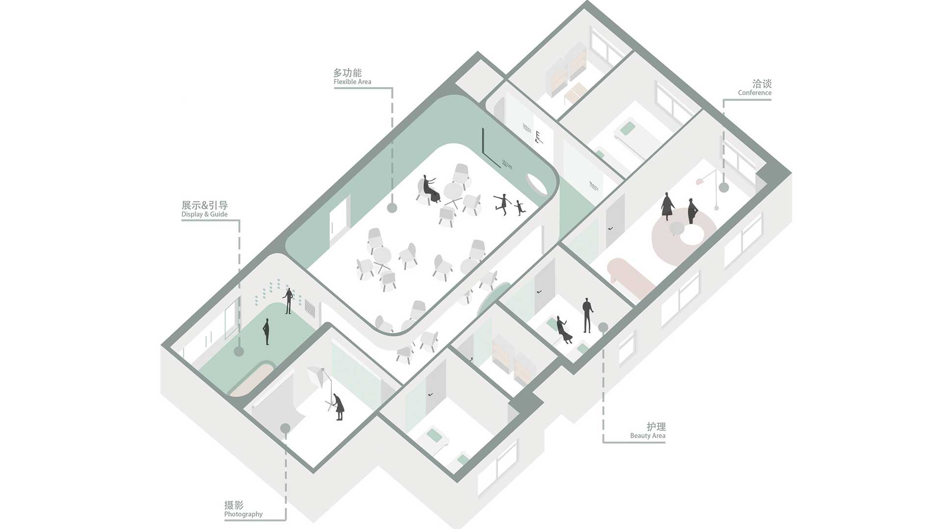 Everybody has his heart in beauty.The ROYAL ROUTE wants the will to be possible and provide customers with possibility.We remould the space on the basis of this idea.A conspicuous aisle connecting to different functional parts is placed in the space. It is inspired by the traditional public medical space.The aim of it is to be taken as the guide.Customers can fully understand and experience each examination item.Thus, they can realize the infinite possibilities of themselves.
