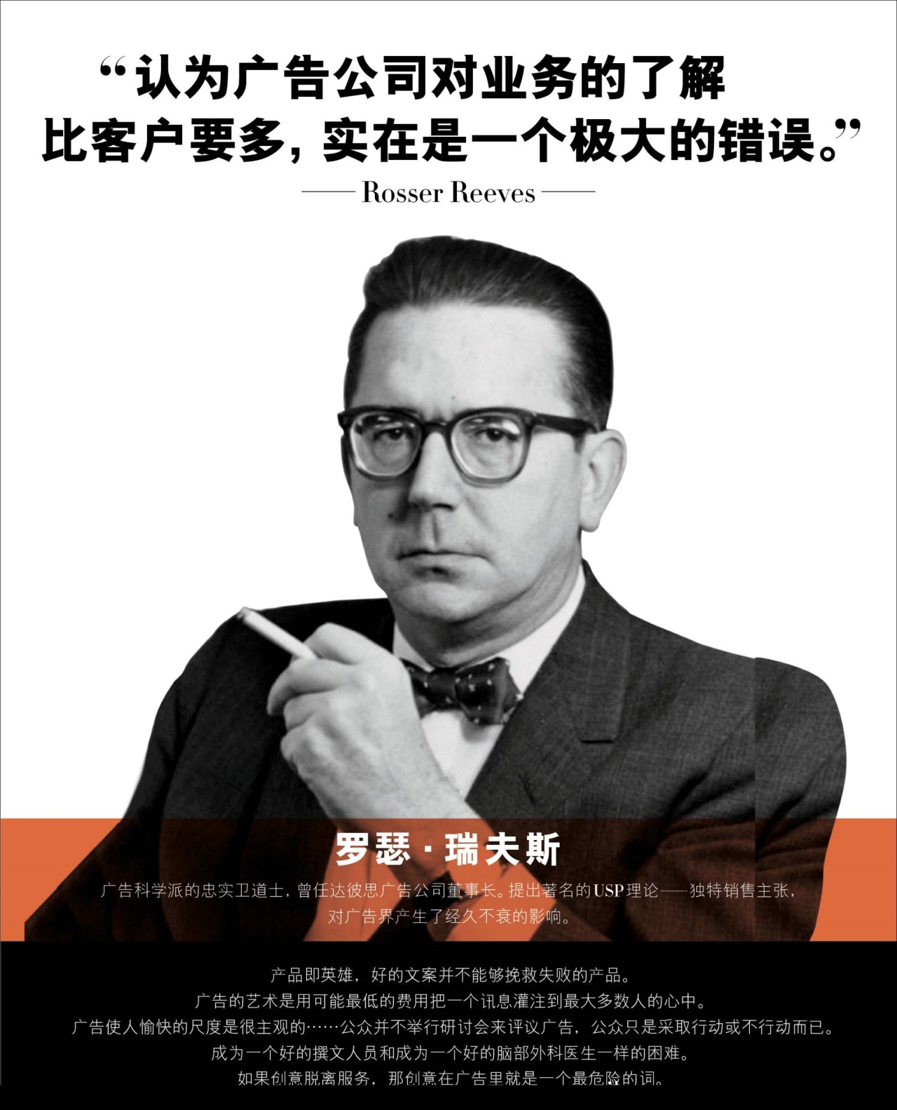1..羅瑟瑞夫斯提出USP理論,要求每一則廣告必須要向消費者說一個“獨特的銷售主張”(USP理論)。比如華帝的35000次點火;公牛的安全插座;農夫山泉有點甜等等。USP解決產品的獨特性,強調產品特殊功效,主張唯一賣點,USP表示只有具備差異化功能價值的產品,才能長久贏得市場。