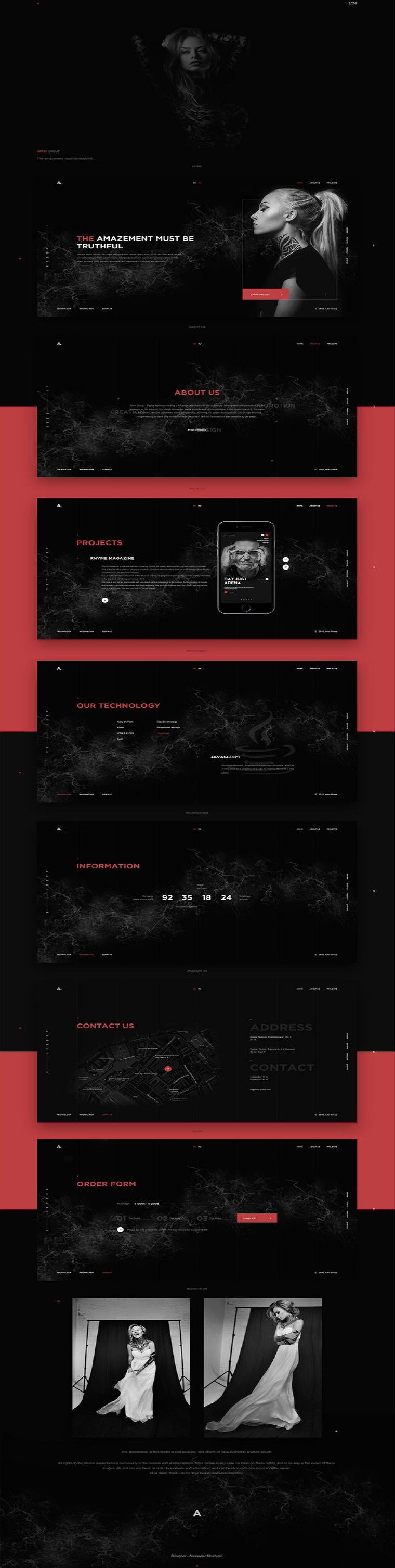 整體采用黑色系與暗紅搭配,不是純黑色,人物素材搭配得當,有神秘感,頁面是分屏效果,左邊采用數字分屏,整體采用柵格排版,右邊人物和線條完美結合背景的煙霧、人物,線條,左下角按鈕構成4個層次,整體有空間感,利用小圓和X點綴整個頁面。