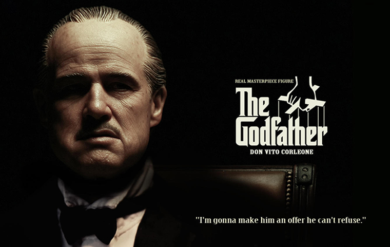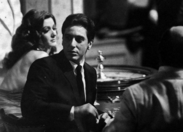 注解:《教父》導演科波拉利用光線制造黑暗,讓維托與邁克爾的臉暗下來,讓人看不清楚,突出兩個教父的神秘感——黑色的神秘